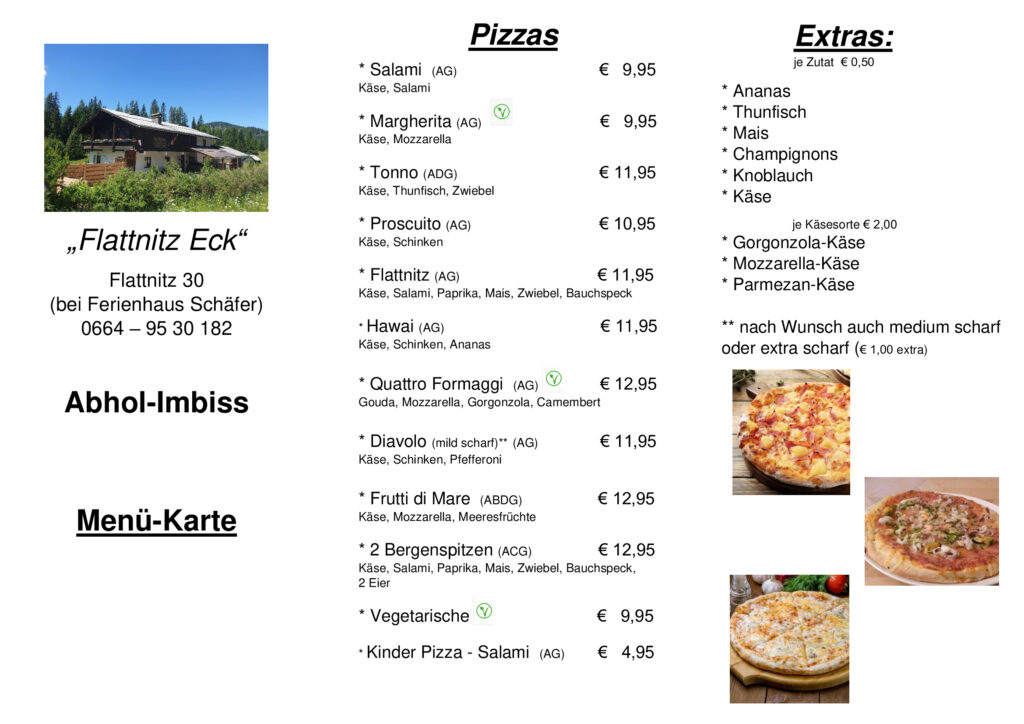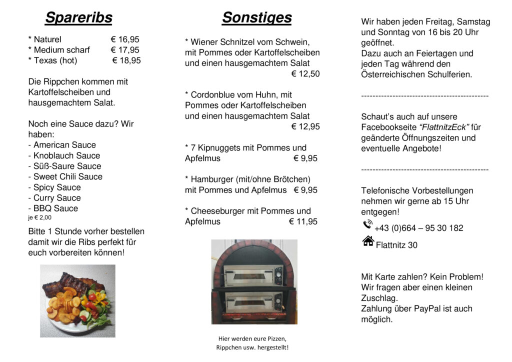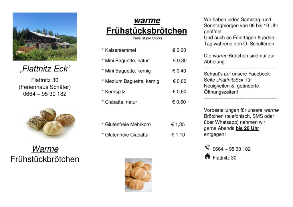 Während Österreichischen Schulferien und Feiertagen haben wir auch unter der Woche geöffnet. Wenn es einen speziellen Anlass hat findet ihr mehr Infos auf unsere Facebookseite Flattnitz Eck.